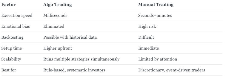 Algo trading is not inherently better than manual trading — it is better for a specific type of trader: systematic, rules-based, data-driven, and patient enough to build and test properly.